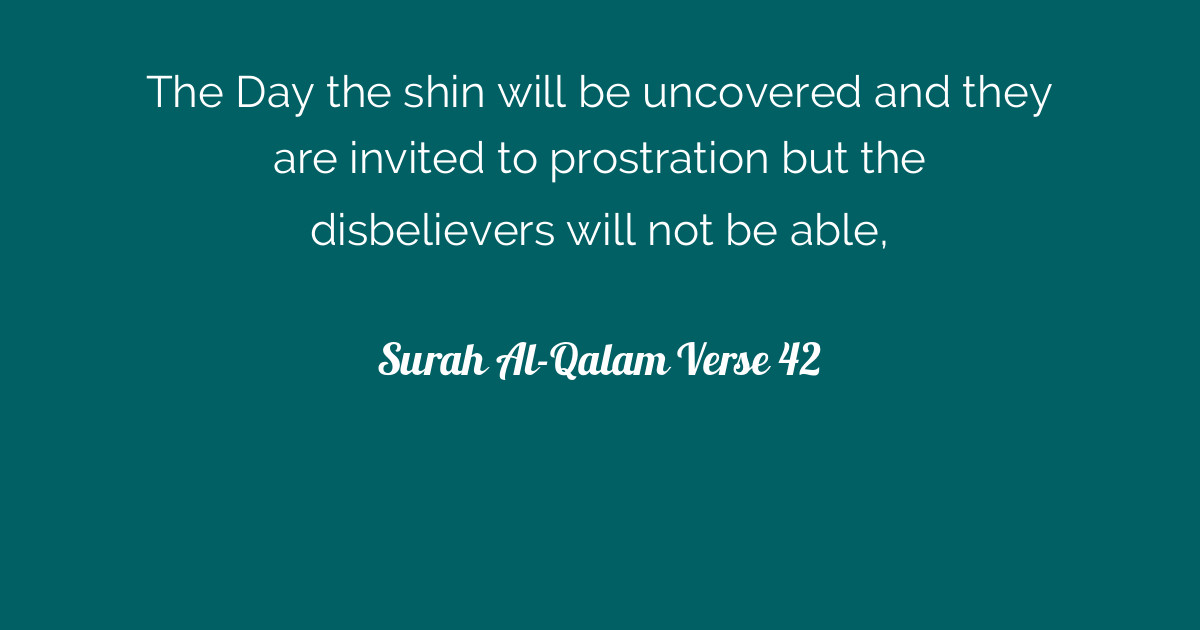 (68:42) on the day when the dreadful calamity will unfold,24 when people will be summoned to prostrate themselves, and yet they . Dan sungguh, dahulu (di dunia) mereka telah diseru untuk bersujud pada . And they were called upon to . And indeed, those who disbelieve would almost make you slip with their eyes when they hear the message, and they say, indeed, he is mad..