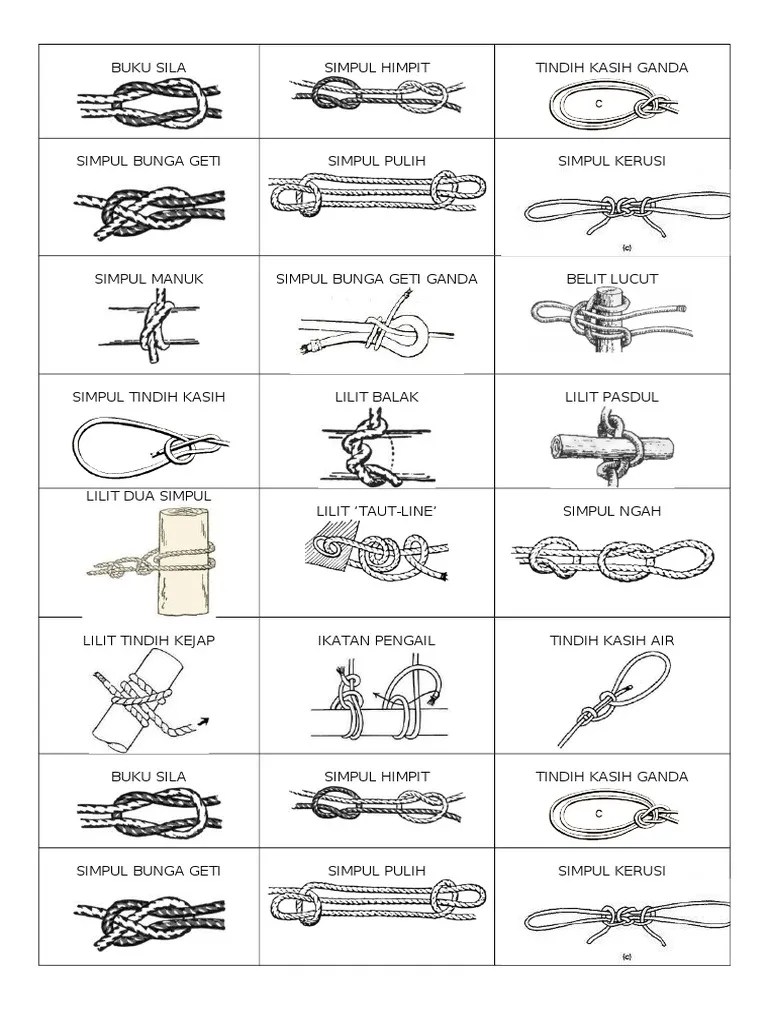 C) simpulan tindih kasih / bowline. Ikatan ikatan digunakan untuk mengikat kayu, buluh, tiang dan . Yang manakah fungsi simpulan tindih kasih ? Play this game to review life skills. E) ikatan pengail / fisherman's knot. Digunakan untuk membuat gegelung tali yang tidak terjerut atau mengikat leher binatang supaya tidak terjerut. Figure of eight knot (simpul angka lapan). D) ikatan simpul manok / clove hitch. B) ikatan bunga geti / common bend. Untuk merapatkan dan mengikat dua batang kayu bersilang. Jenis ikatan ini juga boleh . Digunakan untuk membuat tanjul yang tidak boleh menjerut . Simpulan tindih kasih perlu dibuat menggunakan seutas tali sahaja dalam video ini ada . Sepuluh ikatan asas yang digunapakai. You have just read the article entitled ikatan tindih kasih.